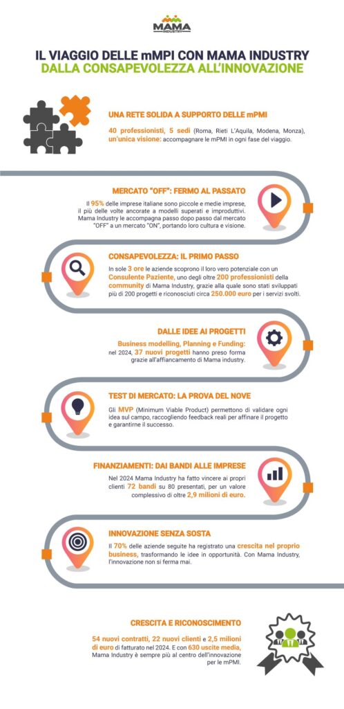 Mama Industry (e la startup collegata Mama Innovation) segue oggi un portfolio di circa 300 clienti, che sono accompagnati in questo viaggio grazie a un team di 40 dipendenti (cresciuto nel 2024 con l’assunzione di 16 nuove risorse), distribuiti in 5 sedi sul territorio italiano (Roma, Rieti, L’Aquila, Modena e Monza) e organizzato in business unit che lavorano in modo integrato e sinergico per coprire ogni aspetto e ogni fase del percorso dei clienti: dalla consulenza alla progettazione del cambiamento, dalla partecipazione ai bandi pubblici per il finanziamento dei progetti, fino al loro sviluppo, passando per la consulenza per il  recruiting delle risorse umane fino agli aspetti di marketing e comunicazione e di primo test sul mercato.